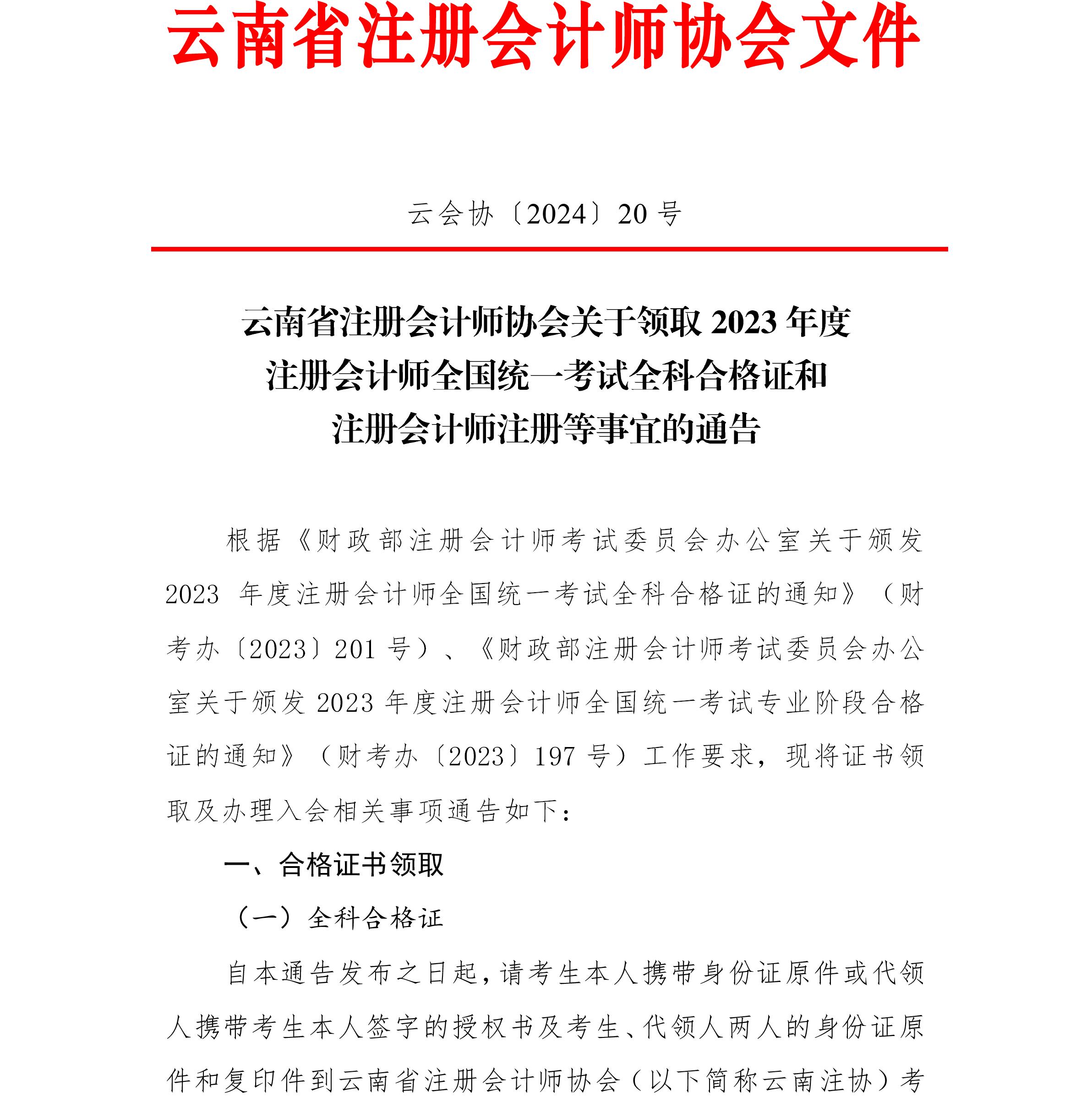 云南:關(guān)于領(lǐng)取2023年度注會(huì)考試全科合格證等事宜的通告