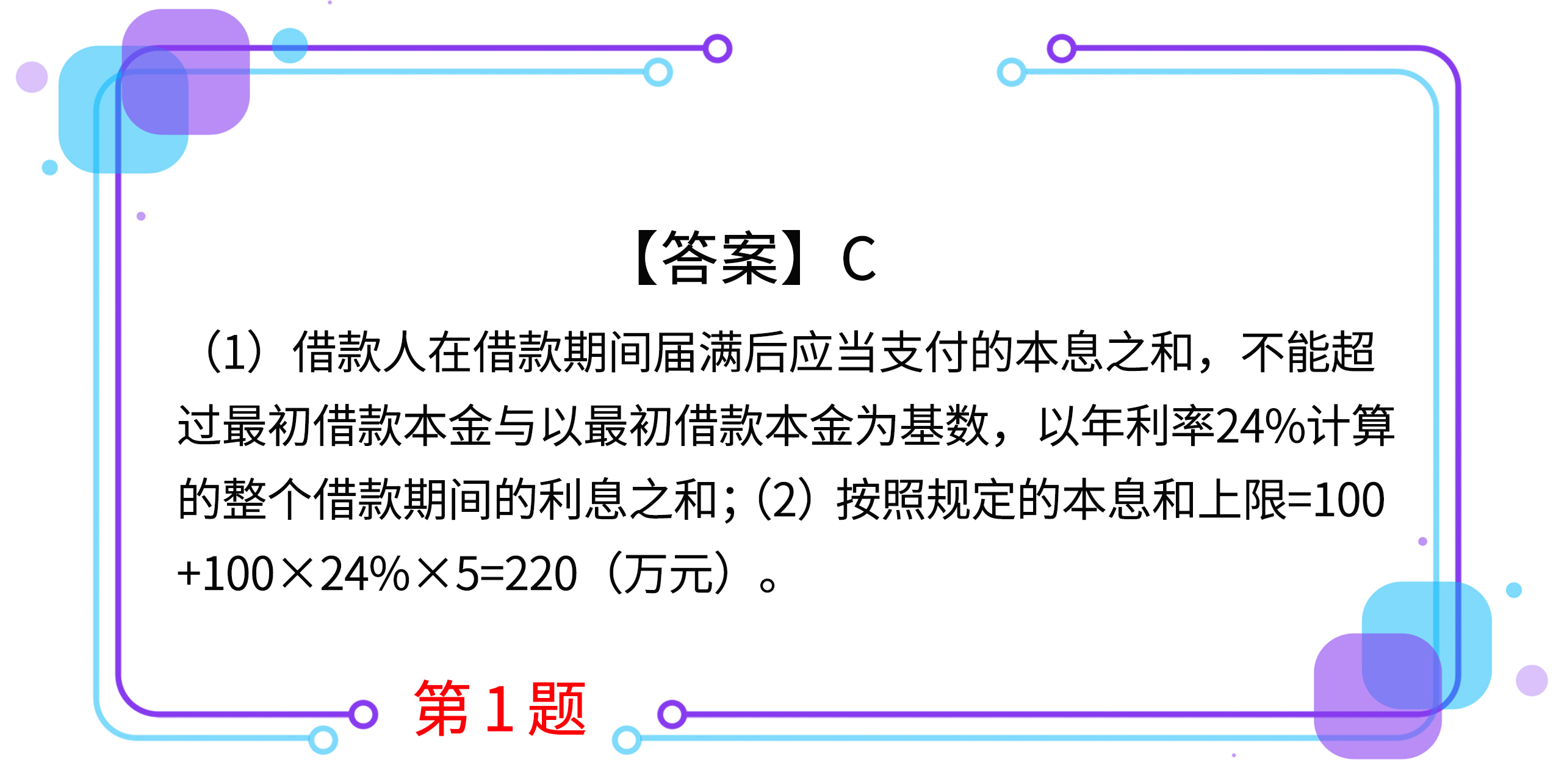 1.甲公司向乙公司借款100萬(wàn)元,約定借款期限為5年,每年為1期并復(fù)利計(jì)息,年利率各期均為20%,每期屆滿后重新出具債權(quán)憑證確認(rèn)上期利息并明確下期本金。根據(jù)合同法律制度的規(guī)定,出借人乙公司在借款期間屆滿后有權(quán)請(qǐng)求甲公司支付的本息和上限為( )萬(wàn)元。