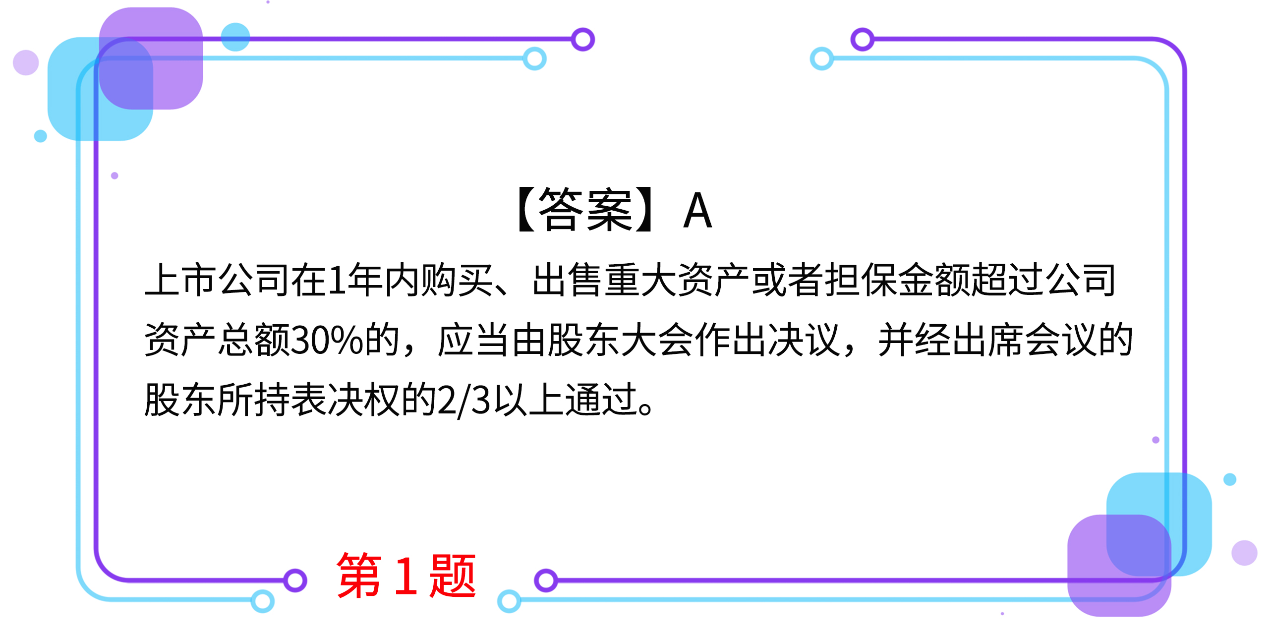 1.根據(jù)公司法律制度的規(guī)定,上市公司在1年內(nèi)出售重大資產(chǎn)超過(guò)公司資產(chǎn)總額一定比例的,應(yīng)當(dāng)由股東大會(huì)作出決議,并經(jīng)出席會(huì)議的股東所持表決權(quán)的2/3以上通過(guò)。該比例是( )。(2019年)