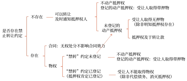 ①如果未登記,受讓人不應(yīng)當(dāng)知道禁止轉(zhuǎn)讓約定的存在,因此,知道或應(yīng)當(dāng)知道抵押權(quán)存在的受讓人取得帶押物、不知道亦不應(yīng)當(dāng)知道抵押權(quán)存在的受讓人取得無(wú)押物。