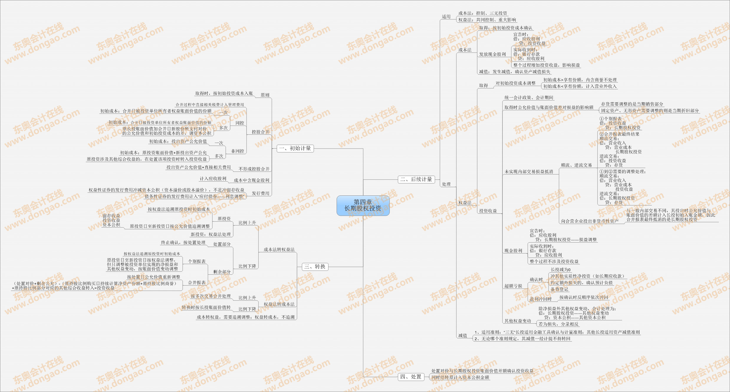 【東奧小編】2014年注冊(cè)會(huì)計(jì)師考試正式進(jìn)入基礎(chǔ)備考階段,注會(huì)知識(shí)點(diǎn)繁雜細(xì)碎,想要全面掌握注會(huì)各科目的知識(shí),需要科學(xué)高效的學(xué)習(xí)方法,思維導(dǎo)圖正是一種非常適合注會(huì)復(fù)習(xí)的學(xué)習(xí)方法,正確利用思維導(dǎo)圖,不僅能使自己積極進(jìn)行知識(shí)點(diǎn)總結(jié),形成清晰的思路,還能對(duì)知識(shí)點(diǎn)進(jìn)行快速查漏補(bǔ)缺。以下是2014注會(huì)《會(huì)計(jì)》第四章長(zhǎng)期股權(quán)投資思維導(dǎo)圖: