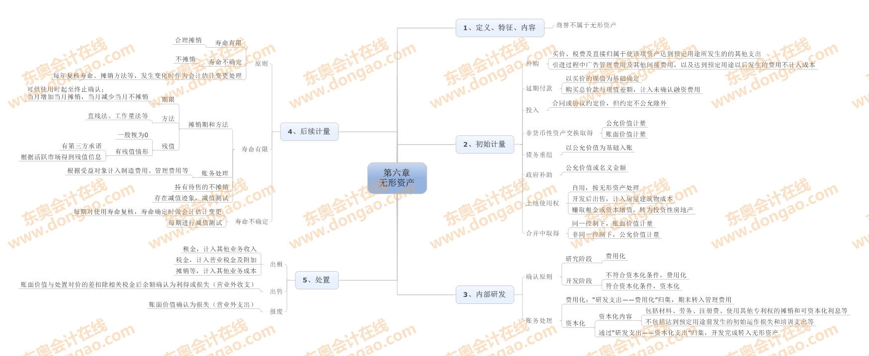 【東奧小編】2014年注冊(cè)會(huì)計(jì)師考試正式進(jìn)入基礎(chǔ)備考階段,注會(huì)知識(shí)點(diǎn)繁雜細(xì)碎,想要全面掌握注會(huì)各科目的知識(shí),需要科學(xué)高效的學(xué)習(xí)方法,思維導(dǎo)圖正是一種非常適合注會(huì)復(fù)習(xí)的學(xué)習(xí)方法,正確利用思維導(dǎo)圖,不僅能使自己積極進(jìn)行知識(shí)點(diǎn)總結(jié),形成清晰的思路,還能對(duì)知識(shí)點(diǎn)進(jìn)行快速查漏補(bǔ)缺。以下是2014注會(huì)《會(huì)計(jì)》第六章無形資產(chǎn)思維導(dǎo)圖: