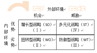 2.劣勢(shì)——機(jī)會(huì)(WO)。扭轉(zhuǎn)型戰(zhàn)略是利用外部機(jī)會(huì)來彌補(bǔ)內(nèi)部劣勢(shì),使企業(yè)改劣勢(shì)而獲取優(yōu)勢(shì)的戰(zhàn)略。存在外部機(jī)會(huì),但由于企業(yè)存在一些內(nèi)部劣勢(shì)而妨礙其利用機(jī)會(huì),可采取措施先克服這些劣勢(shì)。