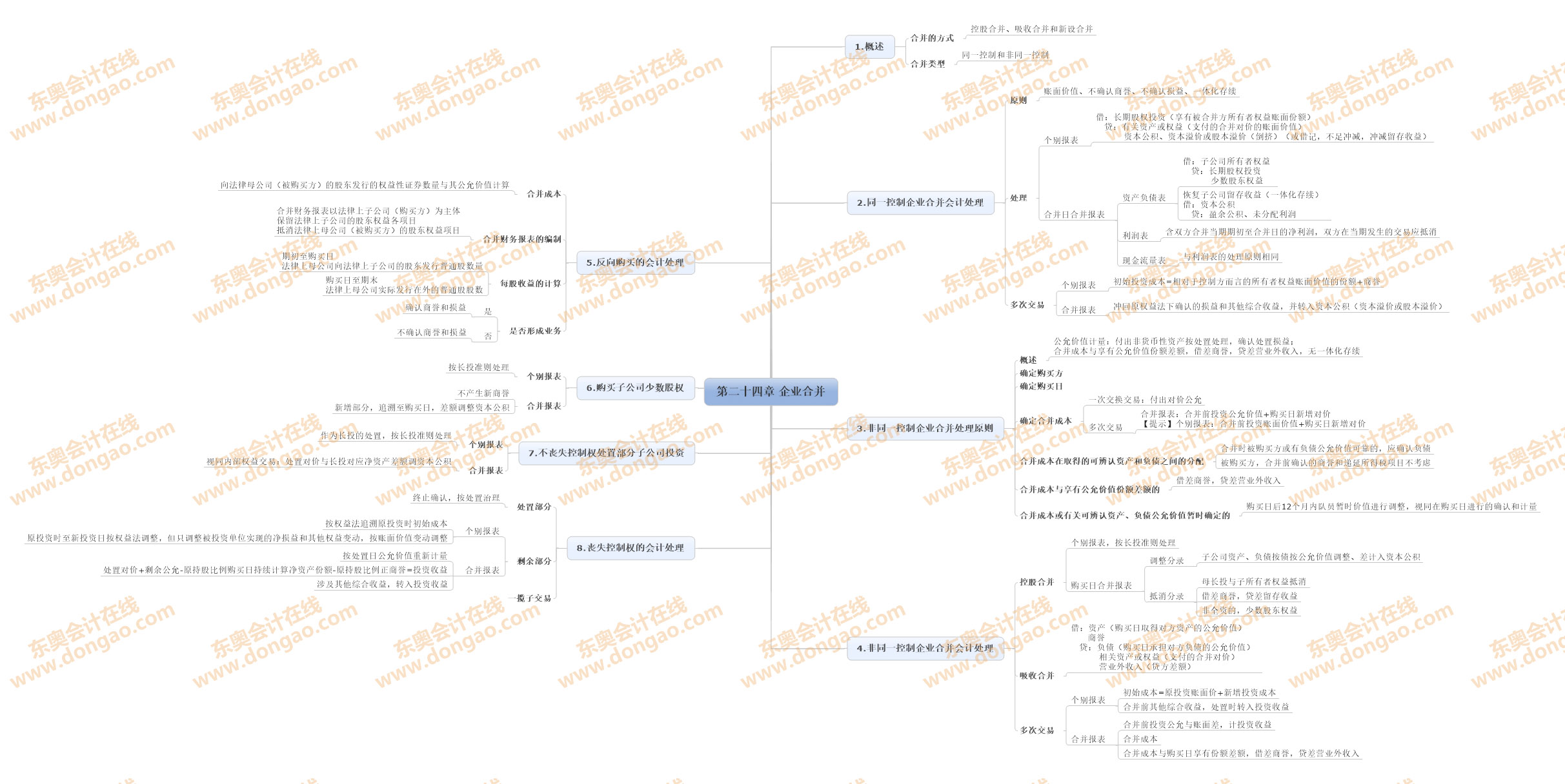 【東奧小編】2014年注冊(cè)會(huì)計(jì)師考試正式進(jìn)入基礎(chǔ)備考階段,注會(huì)知識(shí)點(diǎn)繁雜細(xì)碎,想要全面掌握注會(huì)各科目的知識(shí),需要科學(xué)高效的學(xué)習(xí)方法,思維導(dǎo)圖正是一種非常適合注會(huì)復(fù)習(xí)的學(xué)習(xí)方法,正確利用思維導(dǎo)圖,不僅能使自己積極進(jìn)行知識(shí)點(diǎn)總結(jié),形成清晰的思路,還能對(duì)知識(shí)點(diǎn)進(jìn)行快速查漏補(bǔ)缺。以下是2014注會(huì)《會(huì)計(jì)》第二十四章企業(yè)合并思維導(dǎo)圖: