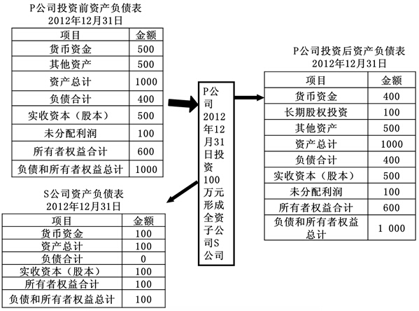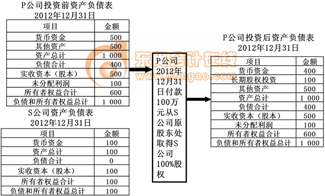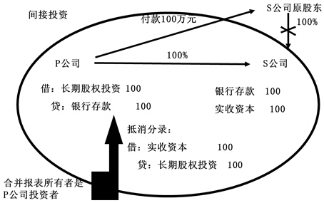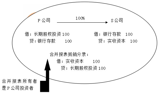 、赑公司投出100萬(wàn)元貨幣資金取得S公司股權(quán),即P公司向S公司原股東支付100萬(wàn)元貨幣資金,取得S公司原股東擁有的S公司股權(quán)。為簡(jiǎn)化,假定S公司資產(chǎn)負(fù)債表中只有銀行存款100萬(wàn)元,實(shí)收資本100萬(wàn)元。作為企業(yè)集團(tuán)整體,相當(dāng)于用100萬(wàn)元貨幣資金取得了S公司原有的資產(chǎn)和負(fù)債(即凈資產(chǎn)),P公司個(gè)別財(cái)務(wù)報(bào)表中的長(zhǎng)期股權(quán)投資和S公司個(gè)別財(cái)務(wù)報(bào)表中的所有者權(quán)益不應(yīng)存在,應(yīng)予抵消。