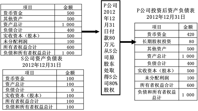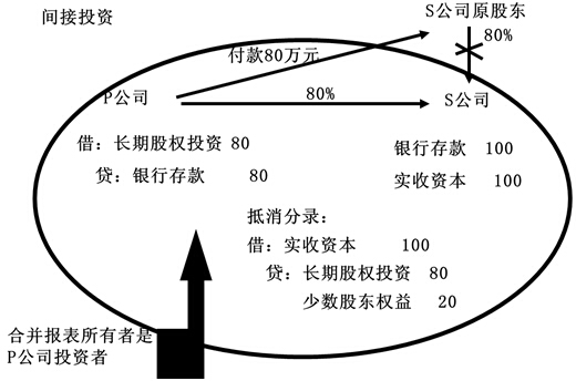 、跴公司投出80萬(wàn)元貨幣資金取得S公司80%股權(quán),即P公司向S公司原股東支付80萬(wàn)元貨幣資金,取得S公司原股東擁有的S公司80%股權(quán)。為簡(jiǎn)化,假定S公司資產(chǎn)負(fù)債表中只有銀行存款100萬(wàn)元,實(shí)收資本100萬(wàn)元。作為企業(yè)集團(tuán)整體,相當(dāng)于用80萬(wàn)元貨幣資金取得了S公司原有資產(chǎn)和負(fù)債的80%(即凈資產(chǎn)的80%)。在合并財(cái)務(wù)報(bào)表中,S公司的所有資產(chǎn)和負(fù)債都要全額反映,其凈資產(chǎn)的20%歸少數(shù)股東所有。因此,合并財(cái)務(wù)報(bào)表中P公司個(gè)別財(cái)務(wù)報(bào)表中的長(zhǎng)期股權(quán)投資和S公司個(gè)別財(cái)務(wù)報(bào)表中的所有者權(quán)益不應(yīng)存在,應(yīng)予抵消,并同時(shí)確認(rèn)少數(shù)股東權(quán)益。