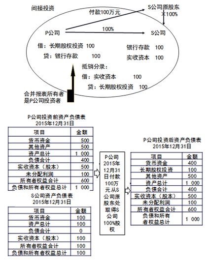 ②P公司投出100萬元貨幣資金取得S公司股權(quán),即P公司向S公司原股東支付100萬元貨幣資金,取得S公司原股東擁有的S公司股權(quán)。為簡化,假定S公司資產(chǎn)負(fù)債表中只有銀行存款100萬元,實(shí)收資本100萬元。作為企業(yè)集團(tuán)整體,相當(dāng)于用100萬元貨幣資金取得了S公司原有的資產(chǎn)和負(fù)債(即凈資產(chǎn)),P公司個別財務(wù)報表中的長期股權(quán)投資和S公司個別財務(wù)報表中的所有者權(quán)益不應(yīng)存在,應(yīng)予抵銷。圖示如下: