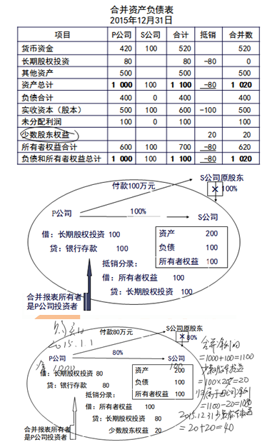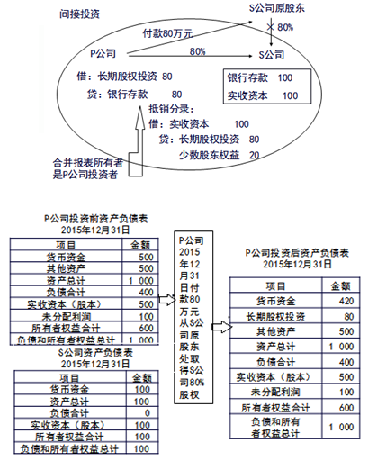 、跴公司投出80萬元貨幣資金取得S公司80%股權(quán),即P公司向S公司原股東支付80萬元貨幣資金,取得S公司原股東擁有的S公司80%股權(quán)。為簡化,假定S公司資產(chǎn)負(fù)債表中只有銀行存款100萬元,實(shí)收資本100萬元。作為企業(yè)集團(tuán)整體,相當(dāng)于用80萬元貨幣資金取得了S公司原有資產(chǎn)和負(fù)債的80%(即凈資產(chǎn)的80%)。在合并財務(wù)報表中,S公司的所有資產(chǎn)和負(fù)債都要全額反映,其凈資產(chǎn)的20%歸少數(shù)股東所有。因此,合并財務(wù)報表中P公司個別財務(wù)報表中的長期股權(quán)投資和S公司個別財務(wù)報表中的所有者權(quán)益不應(yīng)存在,應(yīng)予抵銷,并同時確認(rèn)少數(shù)股東權(quán)益。圖示如下: