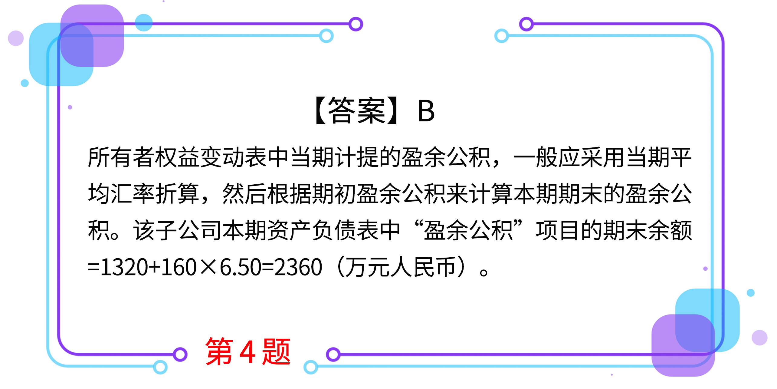 4.某公司境外子公司的記賬本位幣為美元。本期期末即期匯率為1美元=6.40元人民幣,當(dāng)期即期匯率的近似匯率(采用平均匯率確定)為1美元=6.50元人民幣。子公司資產(chǎn)負(fù)債表中“盈余公積”項(xiàng)目年初余額為200萬(wàn)美元,折合人民幣1320萬(wàn)元,本期所有者權(quán)益變動(dòng)表“提取盈余公積”項(xiàng)目金額為160萬(wàn)美元,該子公司利潤(rùn)表采用平均匯率進(jìn)行折算。則子公司本期資產(chǎn)負(fù)債表“盈余公積”項(xiàng)目的期末余額為( )萬(wàn)元人民幣。