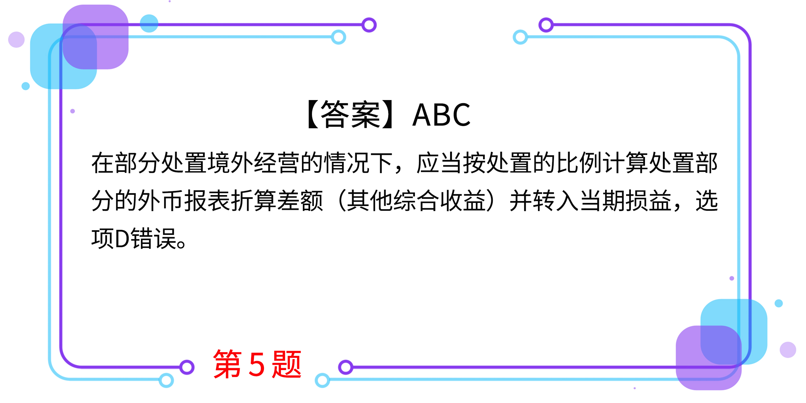 D.在部分處置境外經(jīng)營(yíng)時(shí),應(yīng)將資產(chǎn)負(fù)債表中所有者權(quán)益項(xiàng)目下列示的、與境外經(jīng)營(yíng)相關(guān)的全部其他綜合收益轉(zhuǎn)入當(dāng)期損益