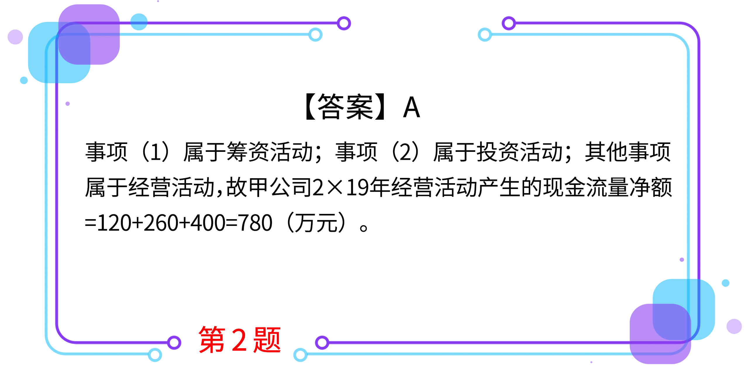 2.甲公司為制造業(yè)企業(yè),2×19年發(fā)生的現(xiàn)金流量:(1)將銷售產(chǎn)生的應(yīng)收賬款申請保理,取得現(xiàn)金1200萬元,銀行對于標(biāo)的債權(quán)具有追索權(quán);(2)購入的作為以公允價(jià)值計(jì)量且其變動(dòng)計(jì)入當(dāng)期損益的金融資產(chǎn)核算的股票支付現(xiàn)金200萬元;(3)收到保險(xiǎn)公司對存貨損毀的賠償款120萬元;(4)收到所得稅返還款260萬元;(5)向其他方提供服務(wù)收取現(xiàn)金400萬元。不考慮其他因素。甲公司2×19年經(jīng)營活動(dòng)產(chǎn)生的現(xiàn)金流量凈額為( )萬元。