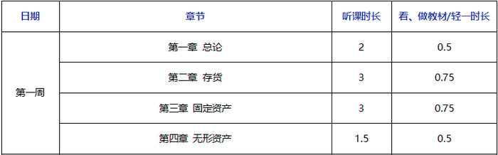 東奧會計在線為大家制定了基礎階段學習計劃表,計劃表清晰地列出了每周學習哪些章節(jié),各章節(jié)學習聽課時長,做題應該花費多少時間,避免考生走彎路、浪費復習時間。以下為學習時間計劃表例圖:
