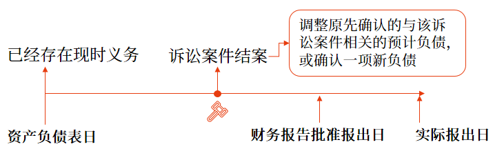 (一)資產負債表日后訴訟案件結案,法院判決證實了企業(yè)在資產負債表日已經存在現(xiàn)時義務,需要調整原先確認的與該訴訟案件相關的預計負債,或確認一項新負債。