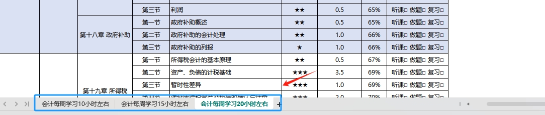 學(xué)習(xí)計(jì)劃表根據(jù)每周學(xué)習(xí)該科目的時(shí)長(zhǎng)劃分為三種情況,分別為“會(huì)計(jì)每周學(xué)習(xí)10小時(shí)左右”、“會(huì)計(jì)每周學(xué)習(xí)15小時(shí)左右”和“會(huì)計(jì)每周學(xué)習(xí)20小時(shí)左右”,考生請(qǐng)根據(jù)自身實(shí)際情況,選擇對(duì)應(yīng)表格。