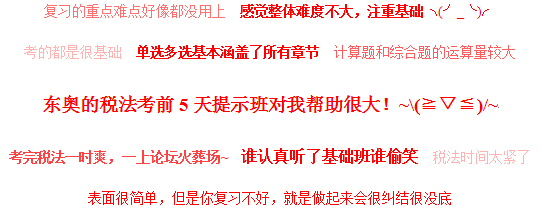 【東奧小編】 2013注冊會計師考后,東奧論壇注會討論區(qū)熱鬧非凡,考生們有對自己的復(fù)習過程進行小結(jié),有感謝辛勤授課的東奧注會老師們,也有對本次考試的難易度進行討論,更有神網(wǎng)友回憶真題,對每一次考試進行全面的總結(jié)分析,于老考生是一次寶貴的考試經(jīng)驗,于明年即將挑戰(zhàn)注會的新考生也有所借鑒意義。今年的《稅法》考試情況如何,請看以下2013注冊會計師《稅法》考后全面總結(jié):