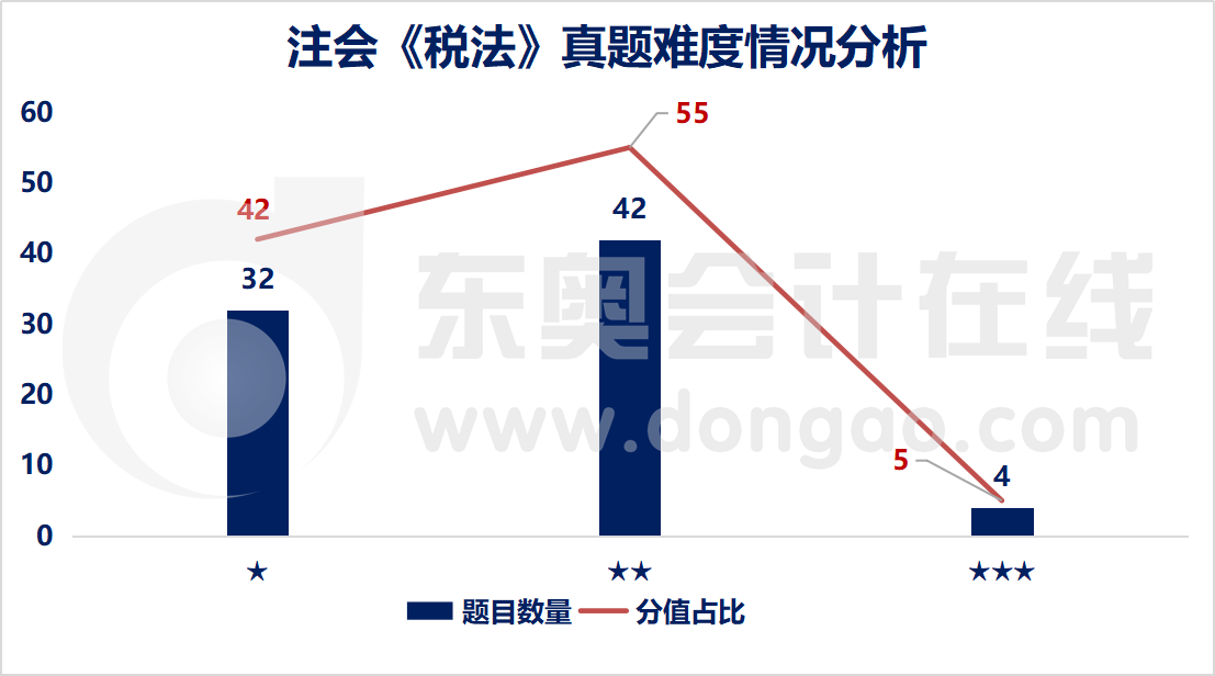 稅法考試中,2星難度考點(diǎn)題量最多,分值也最高;1星難度考點(diǎn)次之,3星難度考點(diǎn)最少。1星難度考點(diǎn)共計(jì)32道題,分值為41分;2星難度考點(diǎn)共計(jì)42道題,分值為53分;3星難度考點(diǎn)共計(jì)4道題,分值為7分。