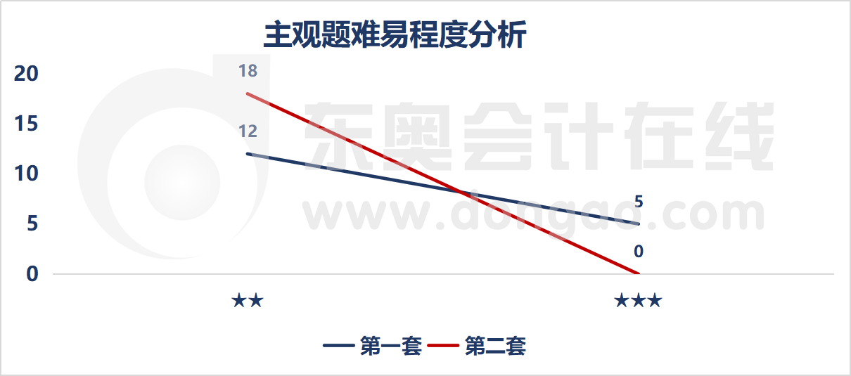 2020年注會戰(zhàn)略考試中,主觀題未出現(xiàn)一星難度考點。第一套試卷中,二星考點最多,為12道,一星考點為5道;第二套試卷考題主要集中在二星難度,三星考點沒有出題。