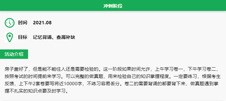 雖說(shuō)綜合階段是三科放在一起考,案例就有6-7千字,會(huì)給人一種綜合性特別強(qiáng)難以入手的錯(cuò)覺(jué)。但是實(shí)際上也沒(méi)有想象中那么的綜合,也僅是個(gè)別的知識(shí)點(diǎn)進(jìn)行融合。而所謂的融合還是要基于單一學(xué)科的基本知識(shí),要想做好綜合題,單一學(xué)科的基本功就一定要扎實(shí)。前中期還是要先復(fù)習(xí)單科基本知識(shí)。在后期進(jìn)行綜合知識(shí)的練習(xí),切忌上來(lái)就開(kāi)始做綜合題,那無(wú)疑是在給自己挖坑。為了幫助大家更好地復(fù)習(xí),特意準(zhǔn)為大家備了學(xué)習(xí)計(jì)劃。