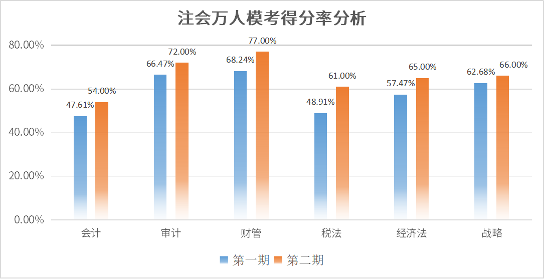 上圖為注會萬人??嫉谝黄诤偷诙诘梅致蕯?shù)據(jù),從上面的數(shù)據(jù)可以看出,萬人模考第二期各科得分率較第一期有較大提升,但會計在兩期模考中,得分率均為最低,錯誤率高居6科榜首!