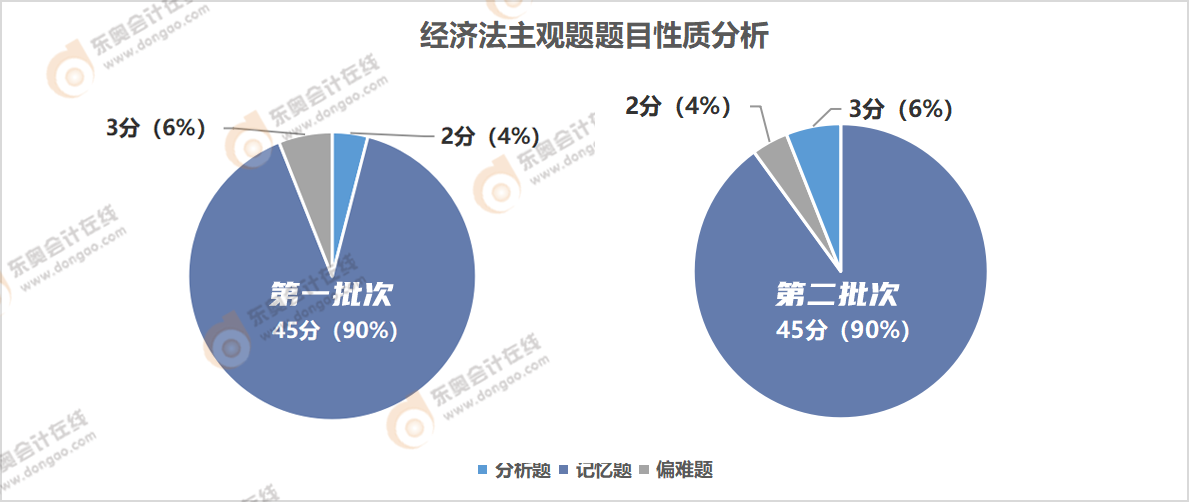 注會(huì)經(jīng)濟(jì)法主觀題考查類型包括分析題、記憶題、陷阱題和偏難題。第一批次考試中,未出現(xiàn)陷阱題,記憶題分值最高,為45分;第二批次考試中,未出現(xiàn)分析題,其中記憶題占比90%,分值為45分。