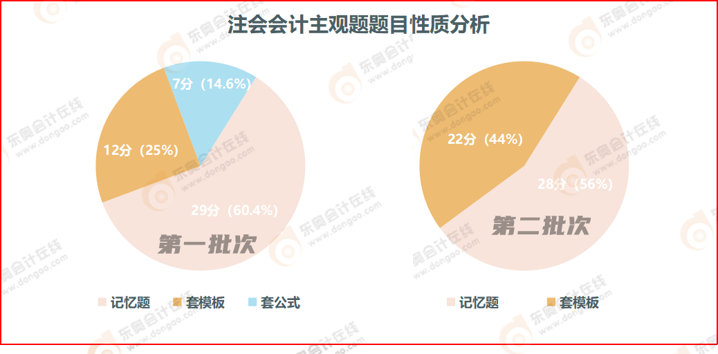 注會會計主觀題考查類型主要有記憶題、套模板題、套公式題。由此可見,注會考試題型靈活,角度多樣。兩個批次的考試中均出現(xiàn)了記憶題及套模板題,第一批次考試中還出現(xiàn)了套公式題。