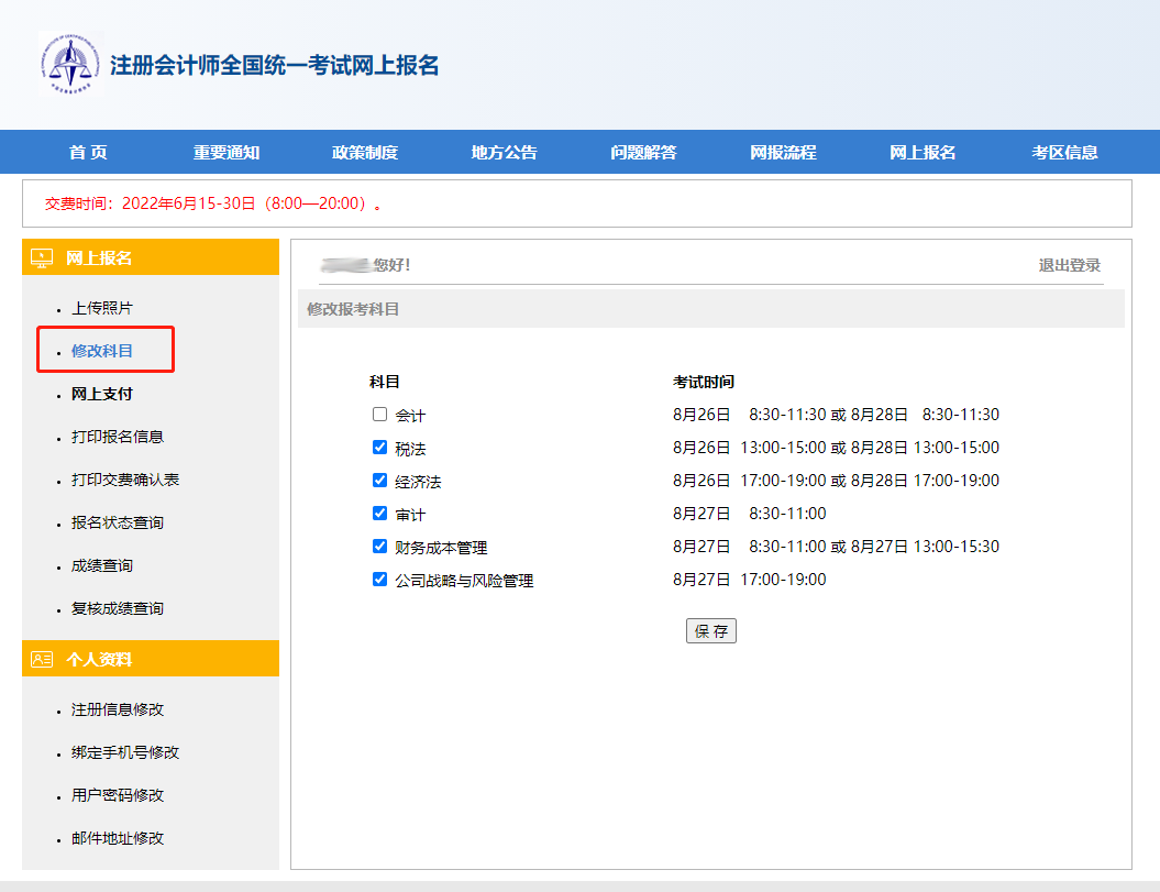 PC端成功登錄后點(diǎn)擊頁(yè)面左側(cè)的“修改科目”選項(xiàng)。結(jié)合備考情況,選擇準(zhǔn)備繳費(fèi)科目,確定點(diǎn)擊“保存”。