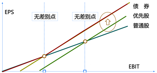通常優(yōu)先股的股利負擔要高于債務稅后利息——即優(yōu)先股線在債券線的下邊,所以考試時大多數(shù)情況下僅需要比較普通股和債券籌資即可。