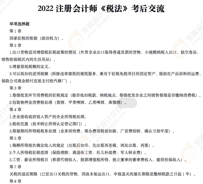 2022年注冊會計師稅法科目第一批次的考試終于結束了,考生們對考試中都考了哪些知識點十分好奇,尤其是對于還未參加考試的第二批次考試的考生以及延考考生來說,第一批次的考試考點十分具有參考意義。在東奧會計在線的直播活動中,各位考生與直播名師積極互動,反饋了很多在本批次考試中遇到的考點內(nèi)容。東奧會計在線為大家整理了文字版本的內(nèi)容,有需要的考生可以閱讀下文了解哦!點擊觀看完整直播>>>