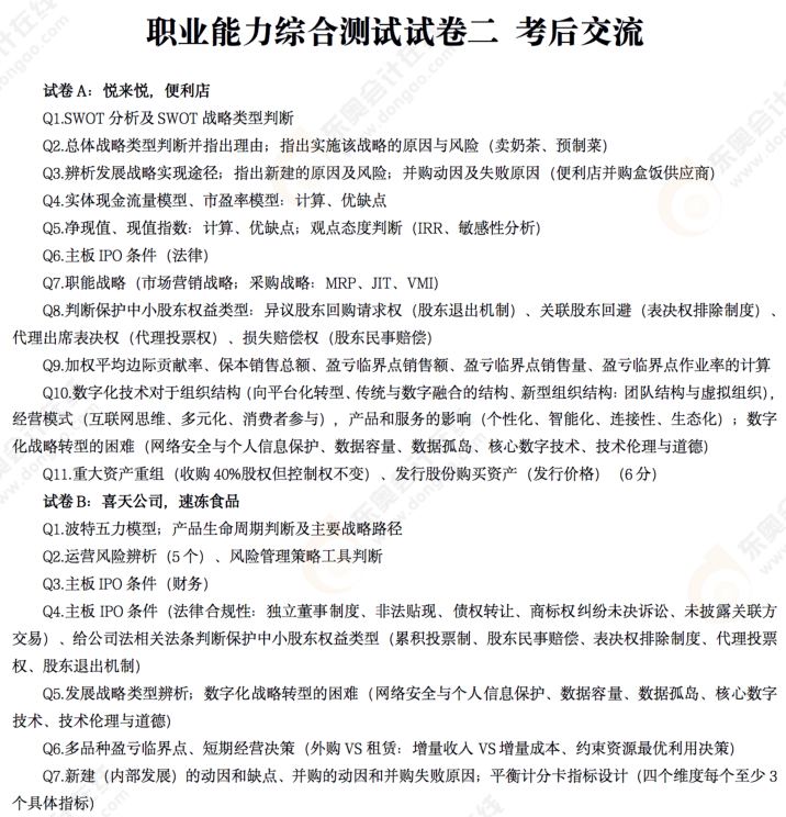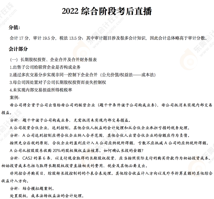 2022年注冊會計師綜合階段的考試已經(jīng)結(jié)束了,距離拿證只差臨門一腳!注會成績預(yù)計于11月下旬下發(fā),在此之前考生們想要對考題考點有所了解??忌鷤冊跂|奧考后直播中反饋了考試中遇到的知識點,東奧會計在線為大家整理出了文字版本,方便大家閱讀觀看!點擊觀看完整直播>>>