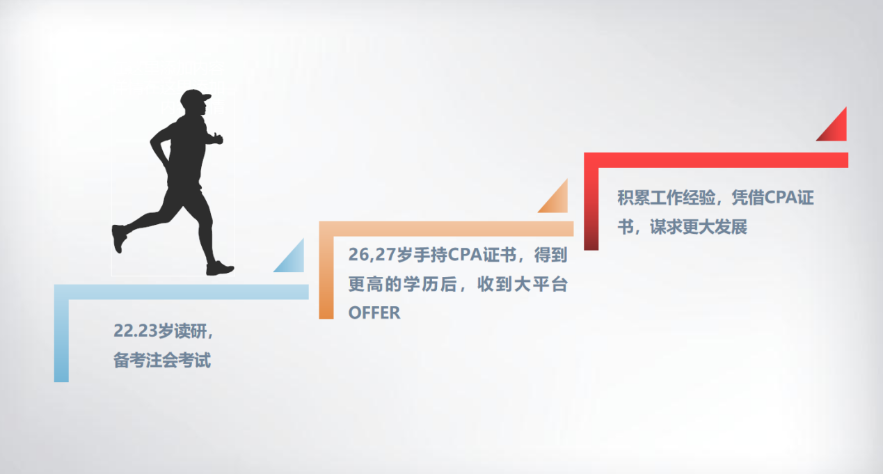 至于CPA證書的考取計(jì)劃,可以等到進(jìn)入公司后再進(jìn)行。假設(shè)您今年22歲、23歲畢業(yè)后進(jìn)入大公司,以“2+1”(兩年通過專業(yè)階段考試,一年通過綜合階段考試)或“3+1”(三年通過專業(yè)階段考試,一年通過綜合階段考試)的模式開啟注會(huì)考試,用三年到四年的時(shí)間拿下CPA證書。而此時(shí)您不僅有證書在手,還有優(yōu)質(zhì)企業(yè)的從業(yè)經(jīng)驗(yàn),無論是原公司晉升到更高職位,或是跳槽到其他平臺(tái)謀求新的發(fā)展,都有了更高的主動(dòng)權(quán)。