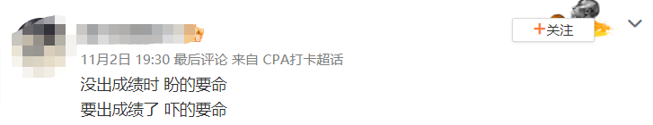 中注協(xié)在注會報名簡章中沒有明確規(guī)定出分具體日期,只表明將于2022年11月下旬公布成績。不僅考生們時刻關注,就連小編也會每天登錄網(wǎng)報系統(tǒng)和微博超話查看注會查分新動態(tài)。注會成績代表著考生們一年來的奮斗成果,大家等出分的焦急心情溢于言表……