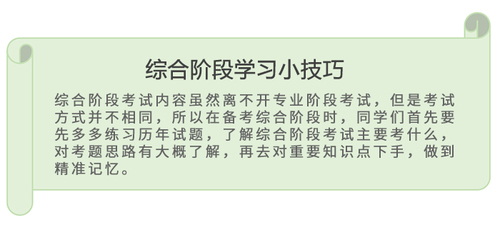 六科考試成績合格的同學(xué)也不可以松懈,接下來等待你的是綜合階段考試,綜合階段考試的兩個(gè)考試科目基本涵蓋了六個(gè)科目考試的內(nèi)容。
