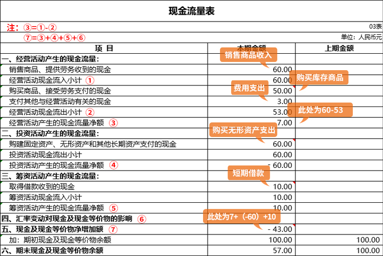 再來看第二個關(guān)系,現(xiàn)金流量表上,經(jīng)營活動中,銷售商品收到60萬元現(xiàn)金,購買商品支出現(xiàn)金50萬元,費用類支出3萬元,經(jīng)營活動產(chǎn)生的現(xiàn)金凈流量凈額為60-50-3=7萬元;投資活動中,用60萬元購買的無形資產(chǎn), 投資活動產(chǎn)生的現(xiàn)金流量凈額為-60萬元;籌資活動中,短期借款10萬元, 籌資活動產(chǎn)生的現(xiàn)金流量凈額為10萬元,現(xiàn)金及現(xiàn)金等價物凈增加額為7+(-60)+10=-43萬元,資產(chǎn)負(fù)債表上期末余額-期初余額=57-100=-43萬元,二者相等,關(guān)系成立。有時候我們也可以借助這個關(guān)系來初步判斷報表是否有填錯的可能性。