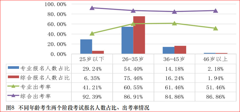 根據(jù)以上數(shù)據(jù)可以看出,這個(gè)年齡段的考生報(bào)名占比較高,出考率也很高。這部分考生一方面是沒(méi)有時(shí)間,缺少精力,還要面對(duì)生活和工作帶來(lái)的壓力,一方面還要考慮未來(lái)的生活,職業(yè)的規(guī)劃,往往陷入迷茫。