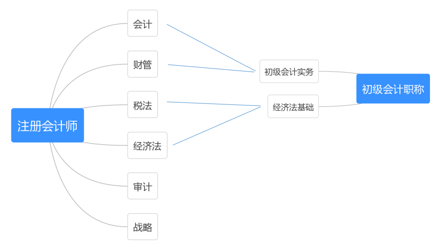 如下圖,注會專業(yè)階段考試中,會計(jì)和財(cái)管科目與初級會計(jì)職稱考試的初級會計(jì)實(shí)務(wù)有較高的契合度。而稅法和經(jīng)濟(jì)法則與初級會計(jì)職稱的經(jīng)濟(jì)法基礎(chǔ)相契合。