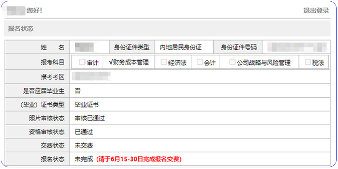 以上例圖【報名狀態(tài)】欄顯示“未完成交費”,說明考生暫未完成報名交費。完成交費后,【交費狀態(tài)】后將顯示“已交費”,【報名狀態(tài)】后將顯示“已完成”。