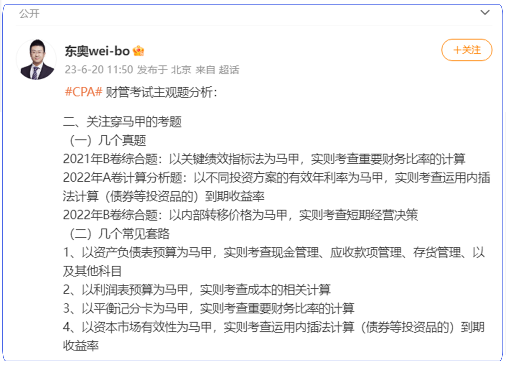 最后,財(cái)管主觀題喜歡設(shè)置“馬甲陷阱”,誤導(dǎo)大家的解題方向。東奧的weibo老師就曾在微博上給出常見的馬甲套路和舉例,大家可仔細(xì)閱讀揣摩,在刷題時(shí)多加注意!