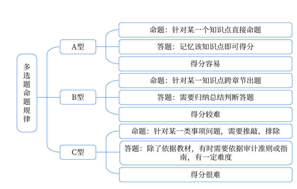 多選題難度較大,它在單選題考查內(nèi)容的基礎上添加了對細節(jié)和跨章節(jié)知識的考查。并且,多選題的答案為2~4個,只有答案與標準答案一致才能得分,多、少、錯選都不得分。想要通過審計考試,多選題保底要拿到18分。