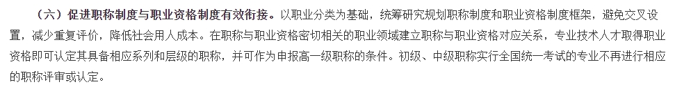 “在職稱與職業(yè)資格密切相關(guān)的職業(yè)領(lǐng)域建立職稱與職業(yè)資格對(duì)應(yīng)關(guān)系,專業(yè)技術(shù)人才取得職業(yè)資格即可認(rèn)定其具備相應(yīng)系列和層級(jí)的職稱,并可作為申報(bào)高一級(jí)職稱的條件。初級(jí)、中級(jí)職稱實(shí)行全國(guó)統(tǒng)一考試的專業(yè)不再進(jìn)行相應(yīng)的職稱評(píng)審或認(rèn)定。”