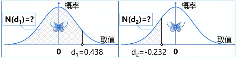 (二)設(shè)d2=-0.232,那么,這一隨機變量的取值小于d2的概率是多少?(記做N(d2));相當于計算下右圖中陰影部分的面積。