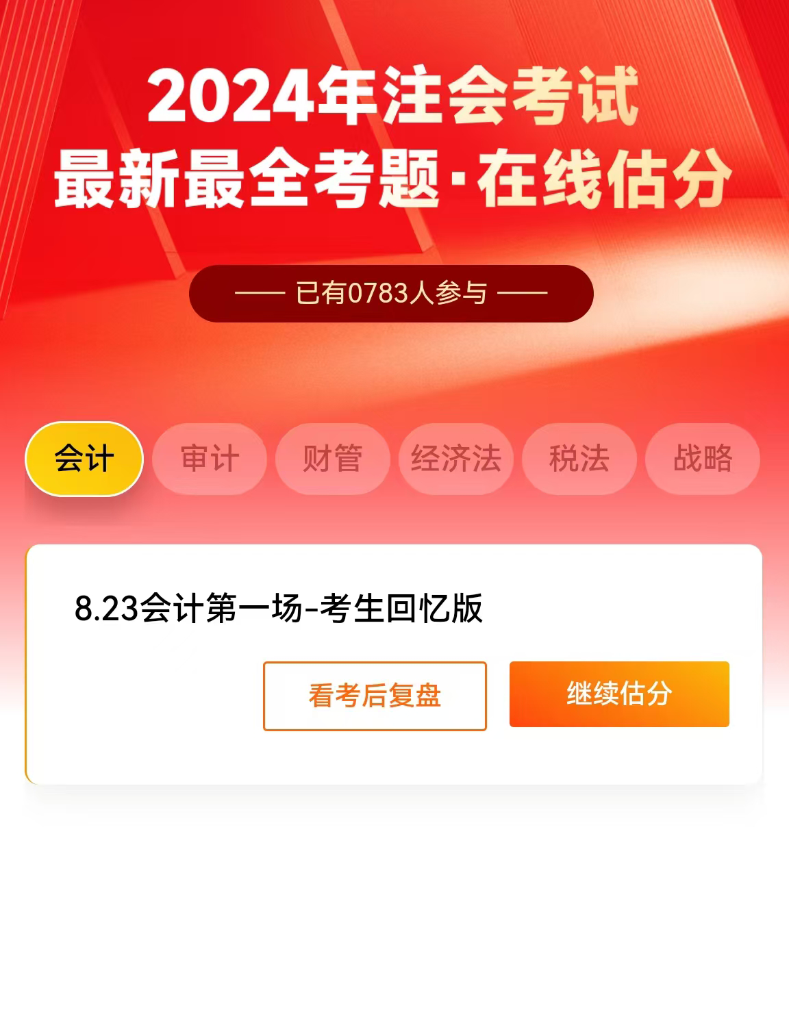估分試題、參考答案及解析由東奧教研團隊根據(jù)考生回憶整理并解答提供,考生可根據(jù)回憶選擇每道題答案,完成后系統(tǒng)會根據(jù)考生選擇結(jié)果進行估分,成績僅供參考,最終成績請考生以官方結(jié)果為準!此外東奧還開展了有獎?wù)黝}活動,點擊參與活動,贏獲獎機會>>2024年注會考試成績下發(fā)時間預(yù)計為11月下旬,預(yù)祝各位考生都能取得理想的成績!