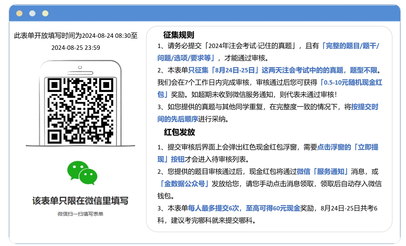 由于注會考試持續(xù)3天,因此本活動將分時段進(jìn)行征集,請各位考生務(wù)必看準(zhǔn)征集真題的日期和題型。完整且有效輸入才更有獲獎機(jī)會。