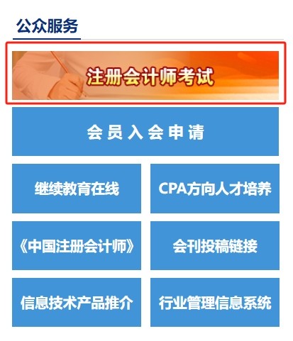 第1步:訪問(wèn)中國(guó)注冊(cè)會(huì)計(jì)師協(xié)會(huì)官方網(wǎng)站(https://www.cicpa.org.cn/),找到“公共服務(wù)”板塊,點(diǎn)擊“注冊(cè)會(huì)計(jì)師考試”。