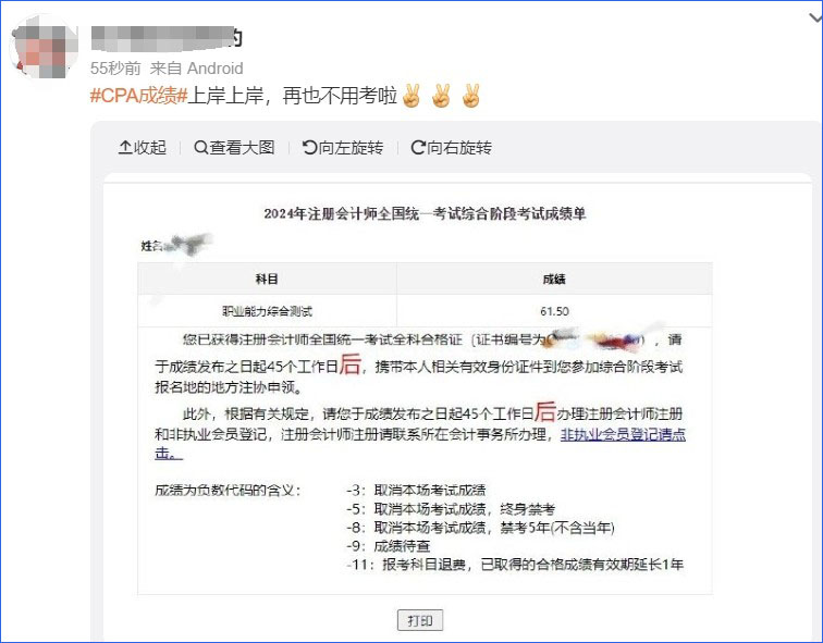2024年注冊會計師考試成績公布啦!小伙伴們對自己這一年來的努力成果是否滿意呢?注會出分后,很多考生帶著激動的心情去社交媒體上報喜。其中不乏有很多已經(jīng)通過綜合階段考試拿到全科合格證書的考生,他們的注會備考之旅已到達終點。接下來,如何領(lǐng)取全科合格證書?如何申請加入注冊會計師協(xié)會成為非執(zhí)業(yè)會員?來看看下文介紹吧!