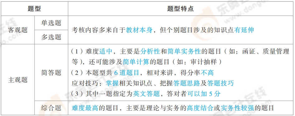 2025 年審計(jì)科目考試題型預(yù)計(jì)仍為單選題、多選題、簡(jiǎn)答題和綜合題共4種題型。近幾年題型特點(diǎn)分析及分值分布情況列示如下。