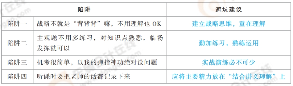 (1)聽課讀書:認真聽課,并對照考試大綱閱讀相關資料(講義、教材或其他各類輔導資料)。第一遍閱讀資料,重點是把每一個知識點搞清楚,明確知識點之間的關系,進而建立戰(zhàn)略思維。對于重點和難點需格外留意,但不能直接忽略非重難點的內(nèi)容,要做到全面復習。