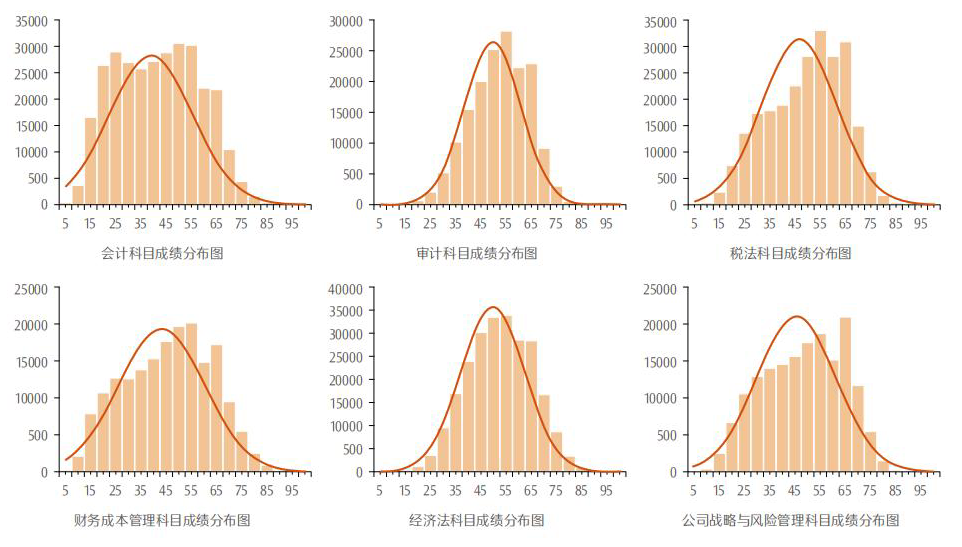 下圖為中注協(xié)發(fā)布的23年注會考試專業(yè)階段各科目分值分布,從中可以看出六門科目不及格的考生中,臨近及格線的考生數(shù)量最多,同時,不同科目的成績分布情況不同,這和科目特點也有一定的關(guān)聯(lián)。