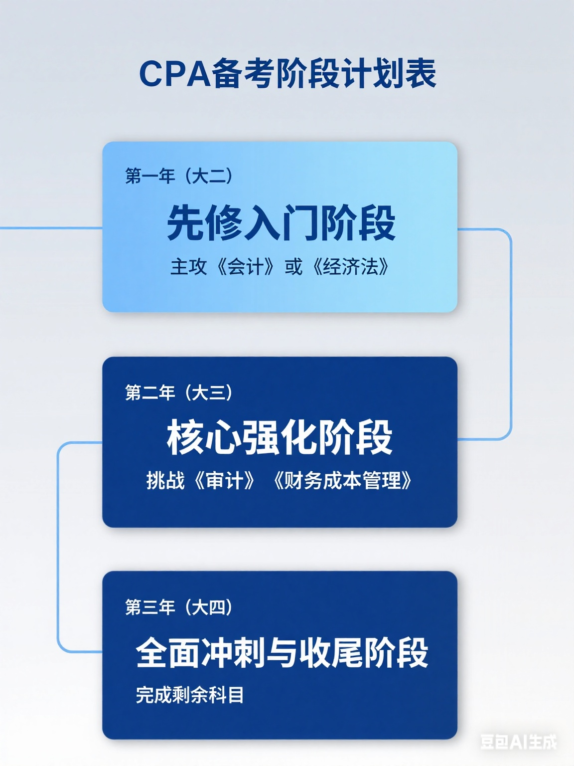 ●第一年(如大二)可作為“先修入門階段”。此階段的目標(biāo)是熟悉cpa考試的基本模式和邏輯,主攻1-2門與當(dāng)前專業(yè)課結(jié)合最緊密或最基礎(chǔ)的科目,如《會(huì)計(jì)》或《經(jīng)濟(jì)法》。