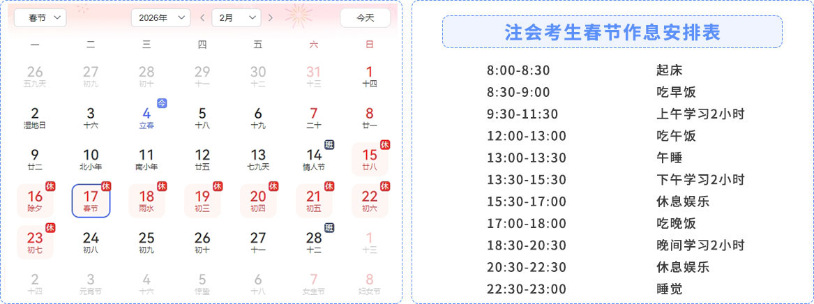 考生可以制定每日作息安排表,將放松娛樂和學習備考穿插開來。建議每日抽出5-6小時用于學習,既保持學習連貫性,又能與家人共度佳節(jié)。