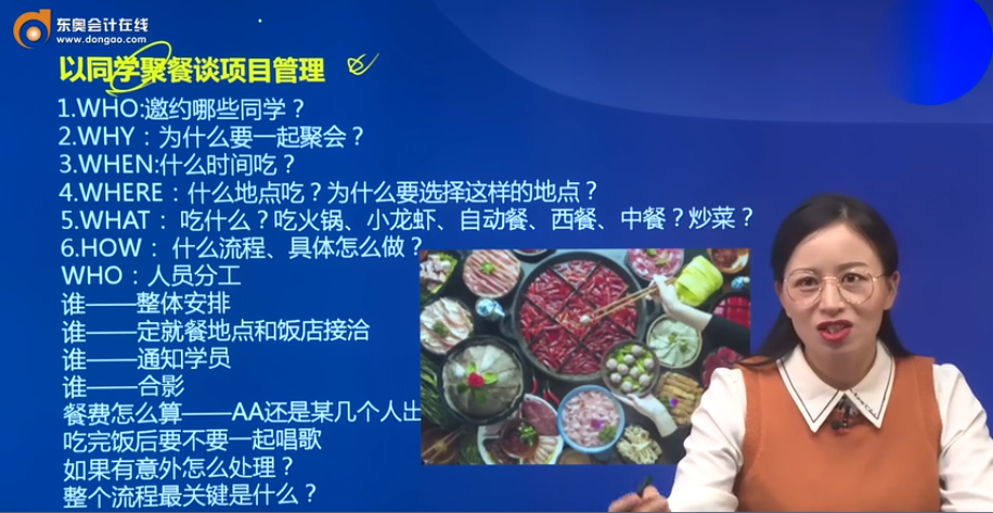 凌紫綺老師在講解項目管理知識點時,以同學聚餐舉例,將項目管理進行植入。